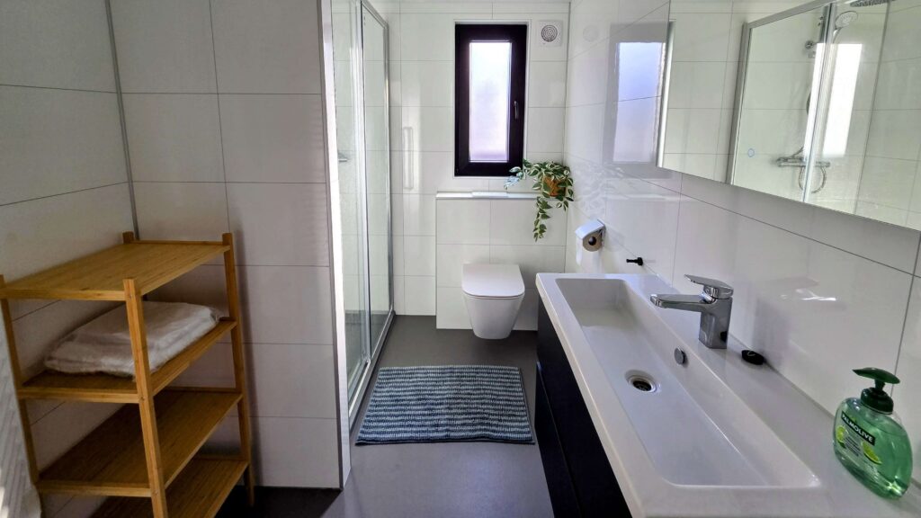 De badkamer is ruim en echt comfortabel. Uw persoonlijke spulletjes kunt u kwijt in de ruime lades van de wastafel, en in het kastje naast de elektrische verwarming. Er zijn voldoende haakjes voor uw kleding.
