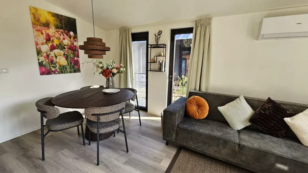 In de woonkamer vindt u ook de airconditioning. Die kan uiteraard koelen maar ook verwarmen als dat nodig is. De handleiding vindt u in de welkomstmap van de lodge.