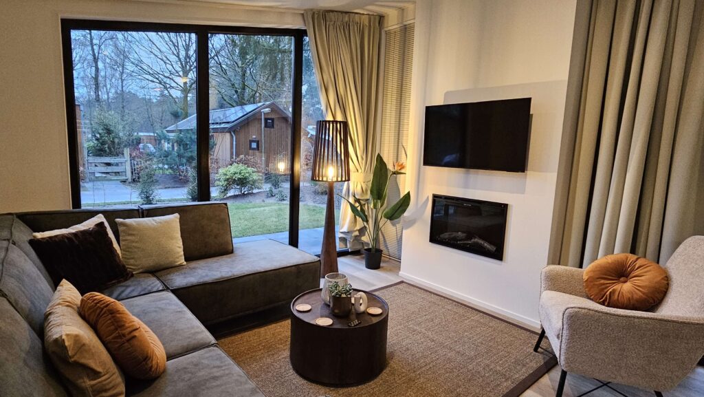 Onder de tv vindt u de elektrische sfeerhaard. Is gewoon supergezellig en voor extra behaaglijke warmte kunt u ‘m ook laten verwarmen.